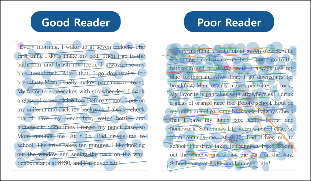 글을 읽는 시선은 일정한 간격으로 점프하며 움직입니다. 유창한 읽기는 응시 시간이 짧고 넓게 건너뛰기 때문에, 진단 결과에서 원(응시)의 크기가 작고, 간격이 넓으며 일정하게 나타납니다.